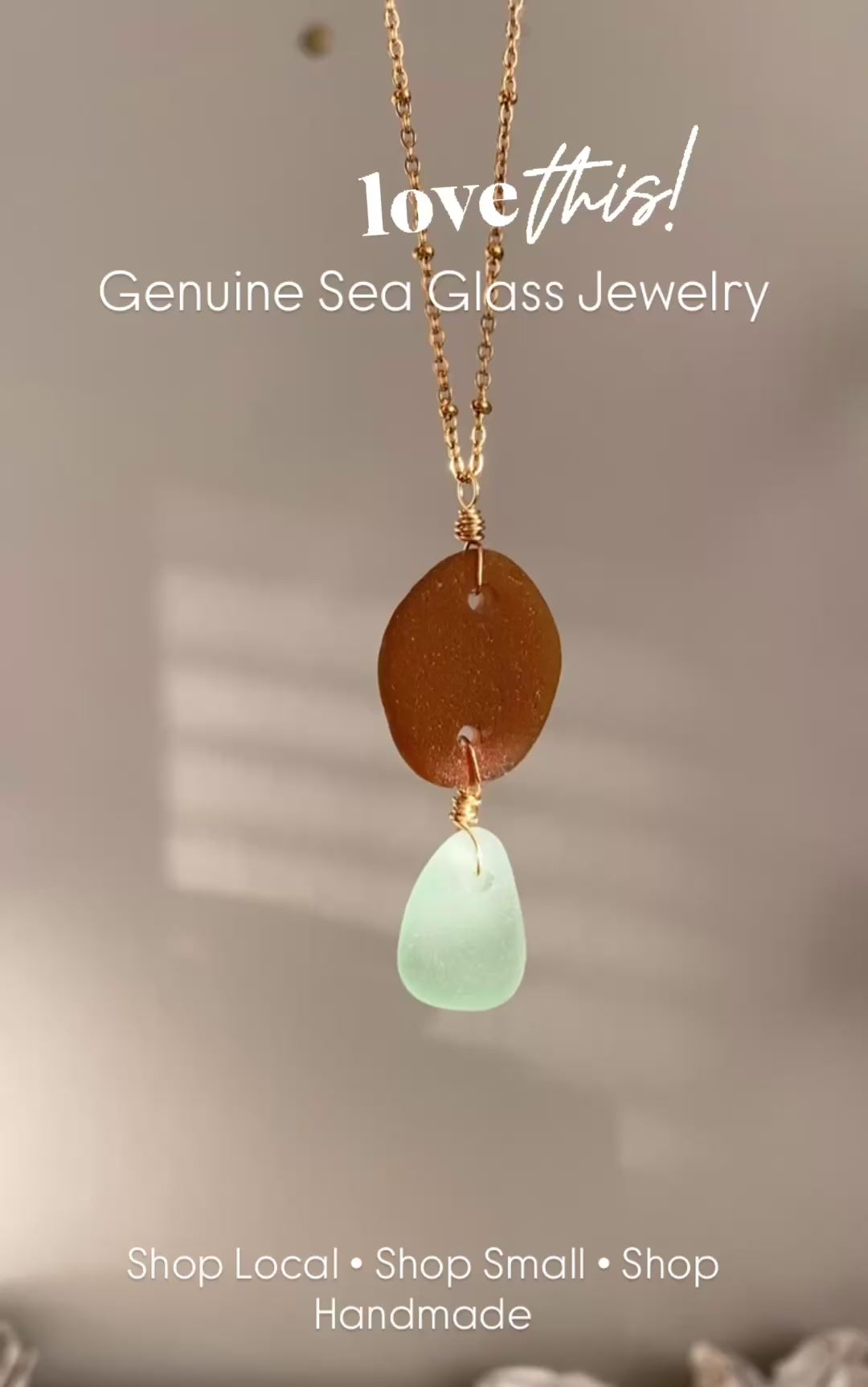 This one-of-a-kind statement necklace features two naturally tumbled pieces of sea glass—one warm brown and one soft sea foam—dangling freely from an 18k PVD gold adjustable chain (16–18").