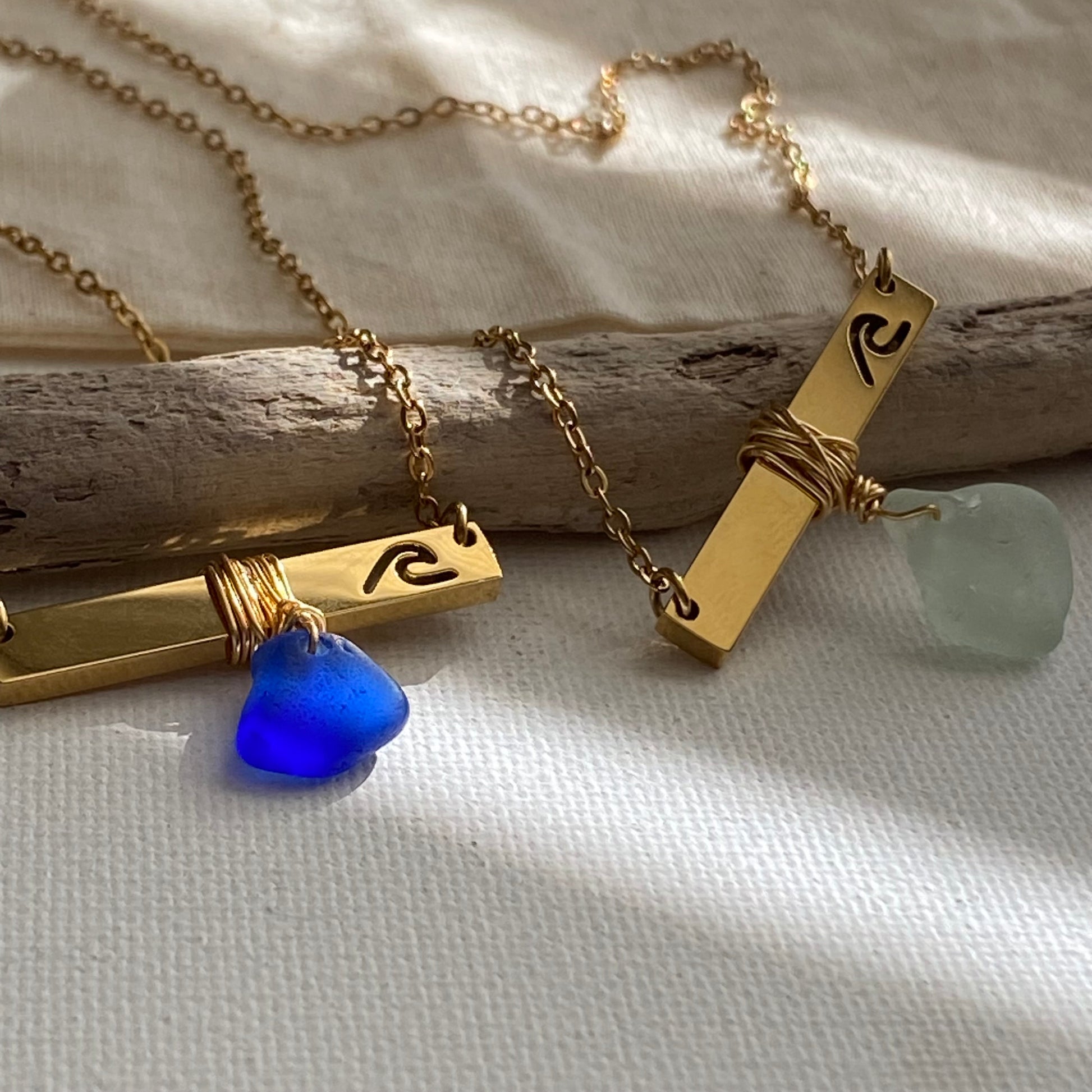 Gold Wave Bar Necklace with Sea Foam Sea Glass