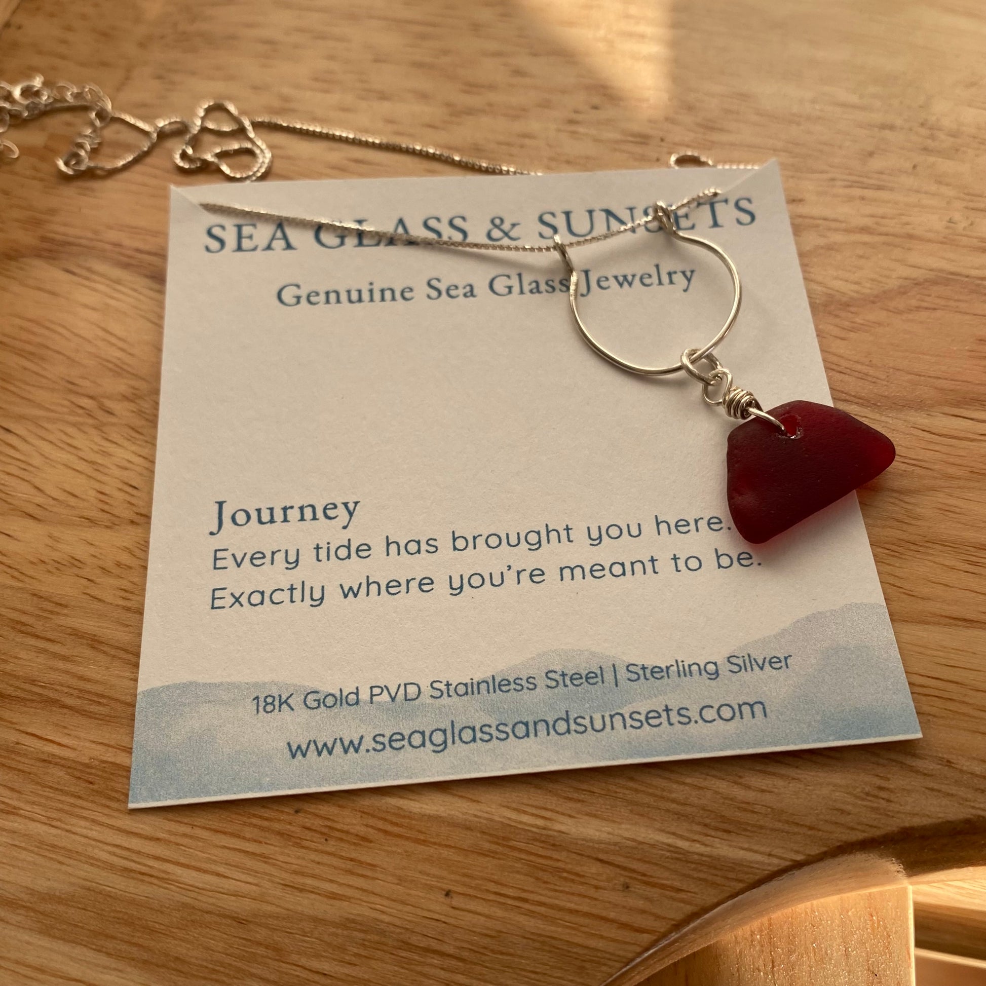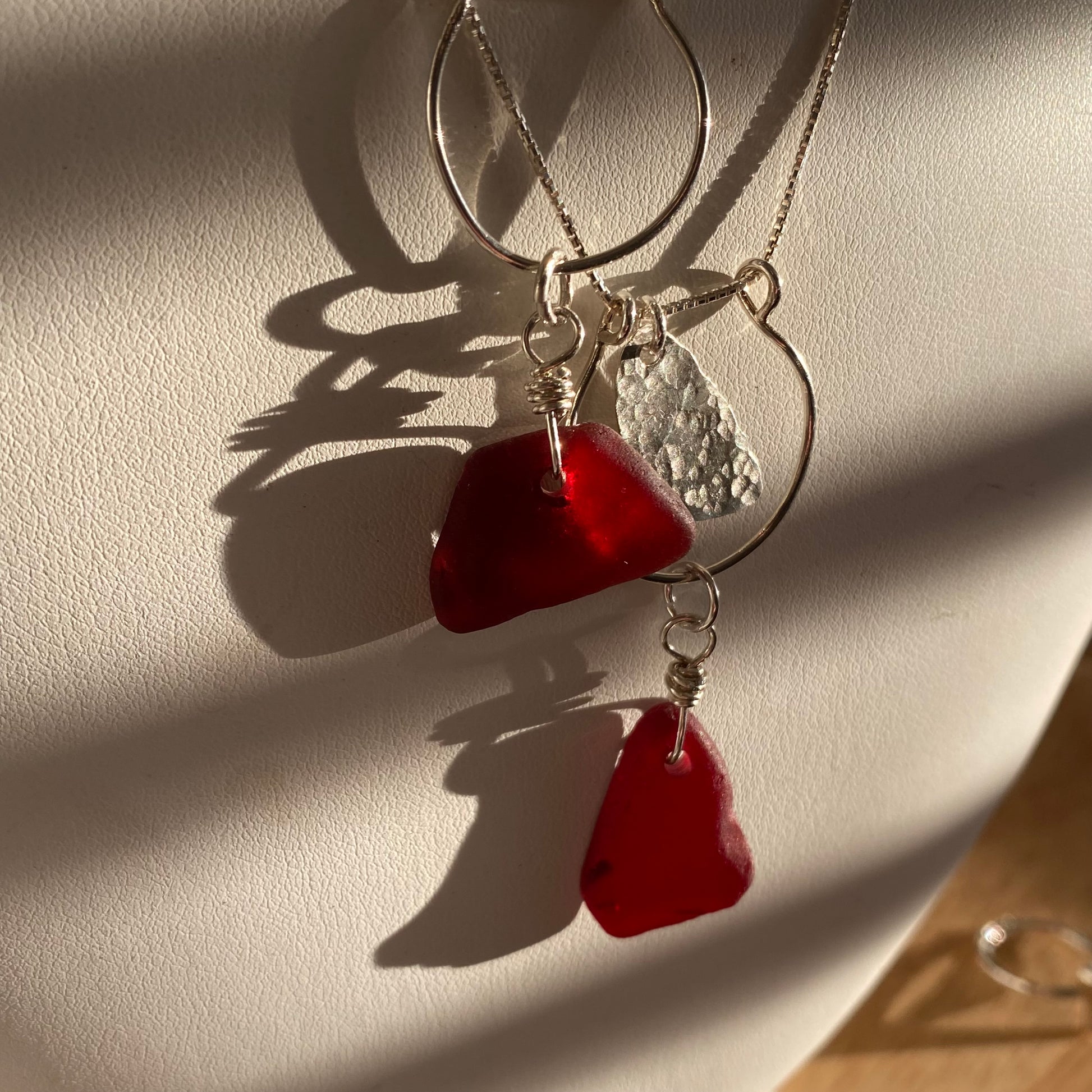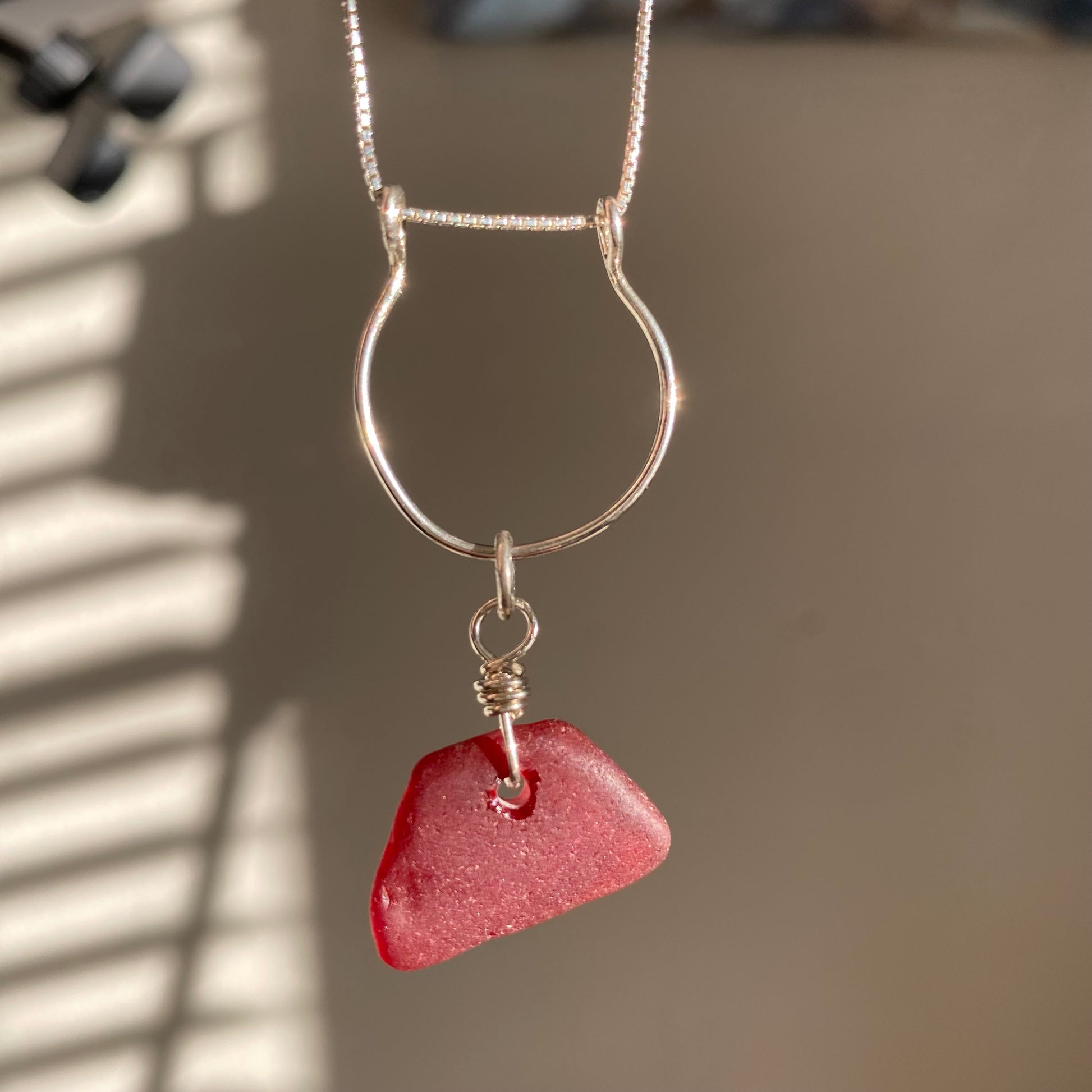 This deep red sea glass is an exceptional find — likely once part of a vintage nautical light, signal glass, or early bottle — carried and softened by the sea over decades before finally revealing itself. Pieces like this are rarely found, and even more rarely left untouched, making this necklace truly one of a kind.