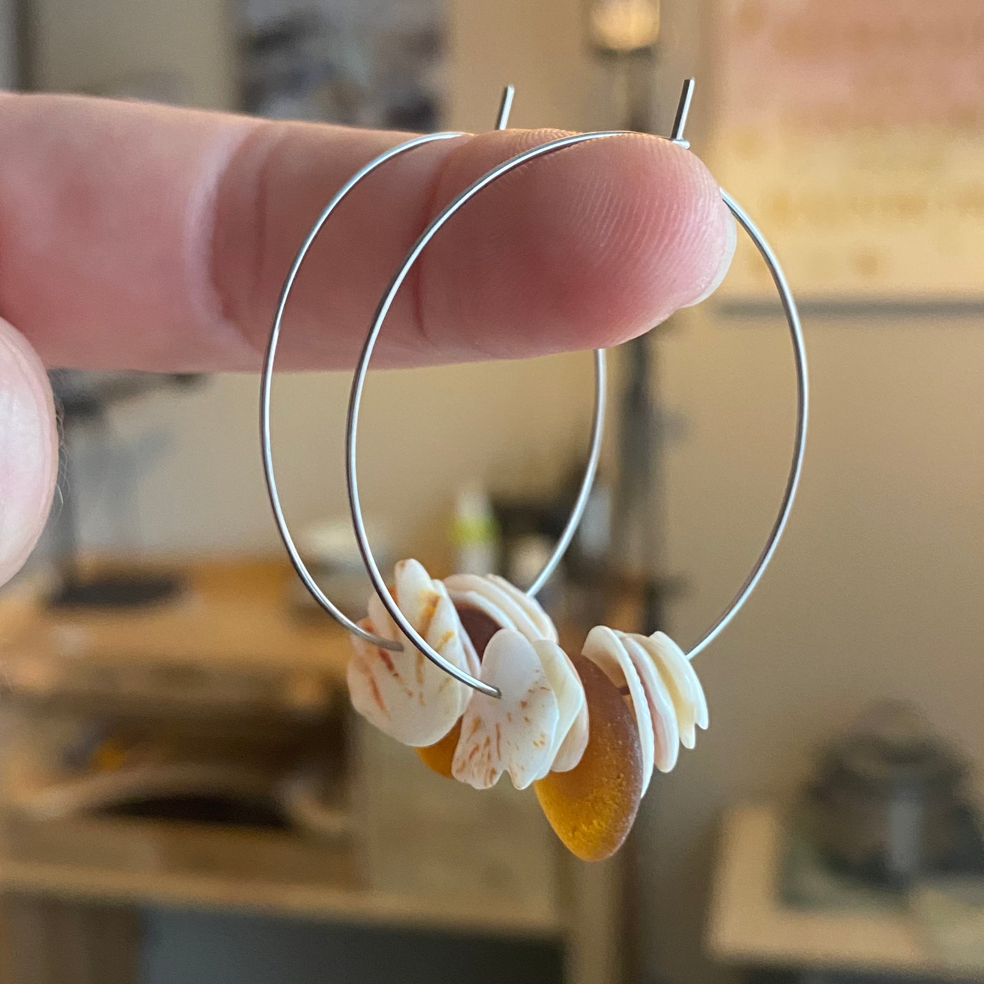 Lightweight hoops made with real sea glass and tiny crushed shells, perfect for sunset walks and everyday mermaid vibes. Made with stainless steel, so they’re allergy-friendly and won’t tarnish—wear them worry-free all year long!