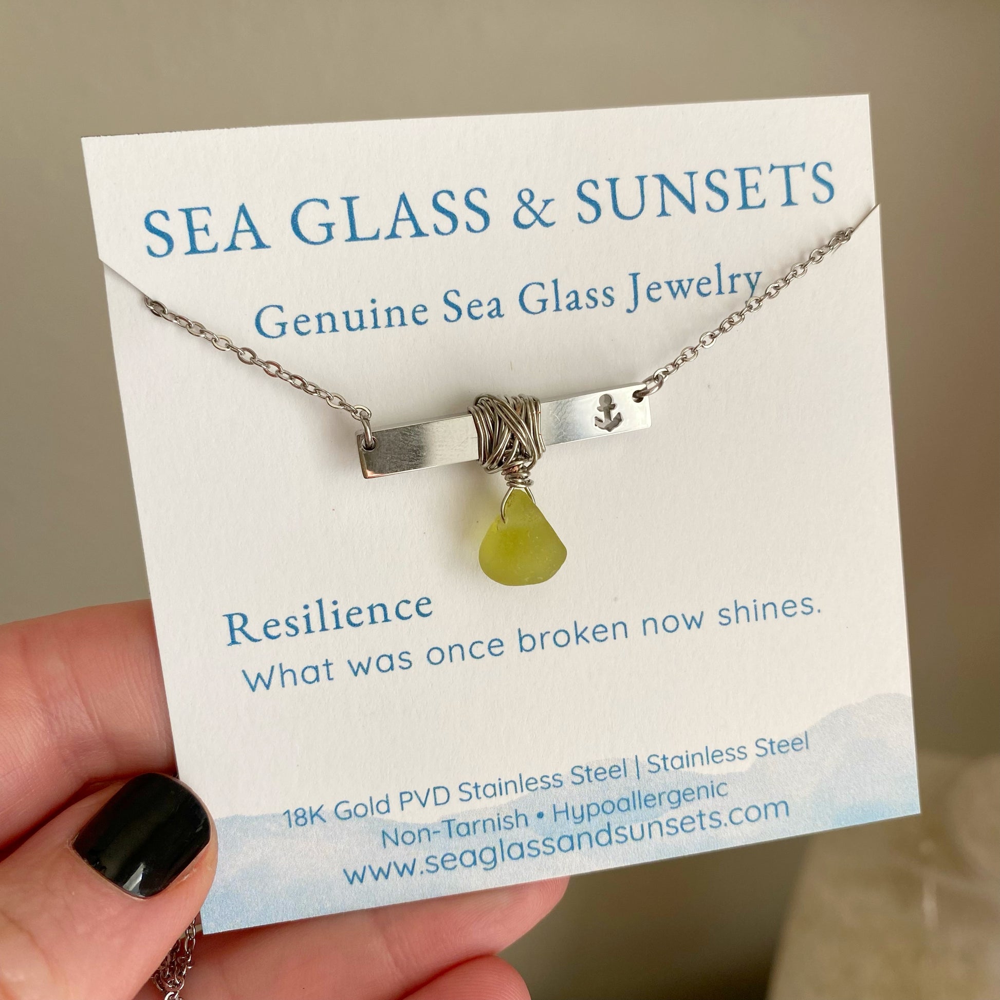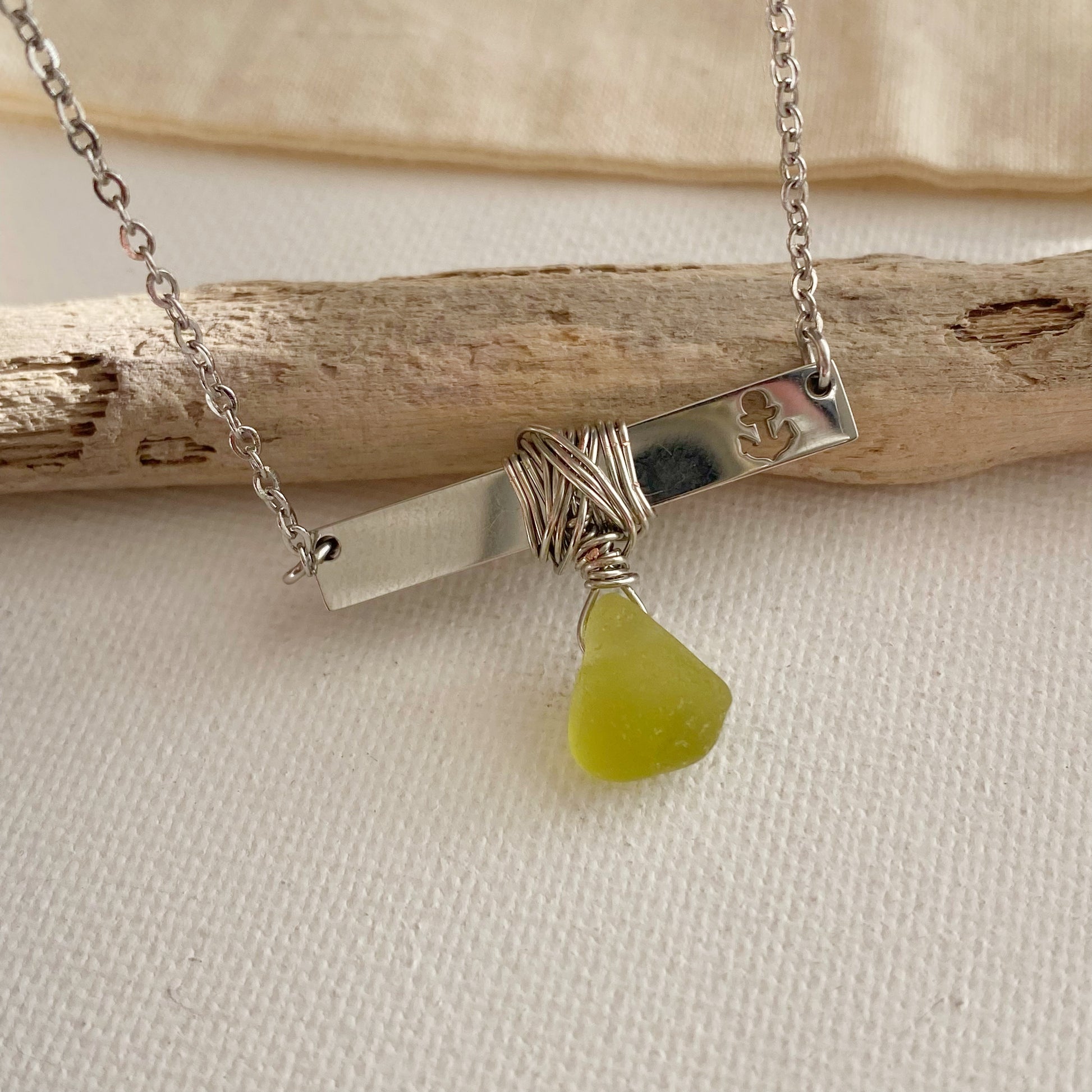 Silver Anchor Bar Necklace with Citron Sea Glass