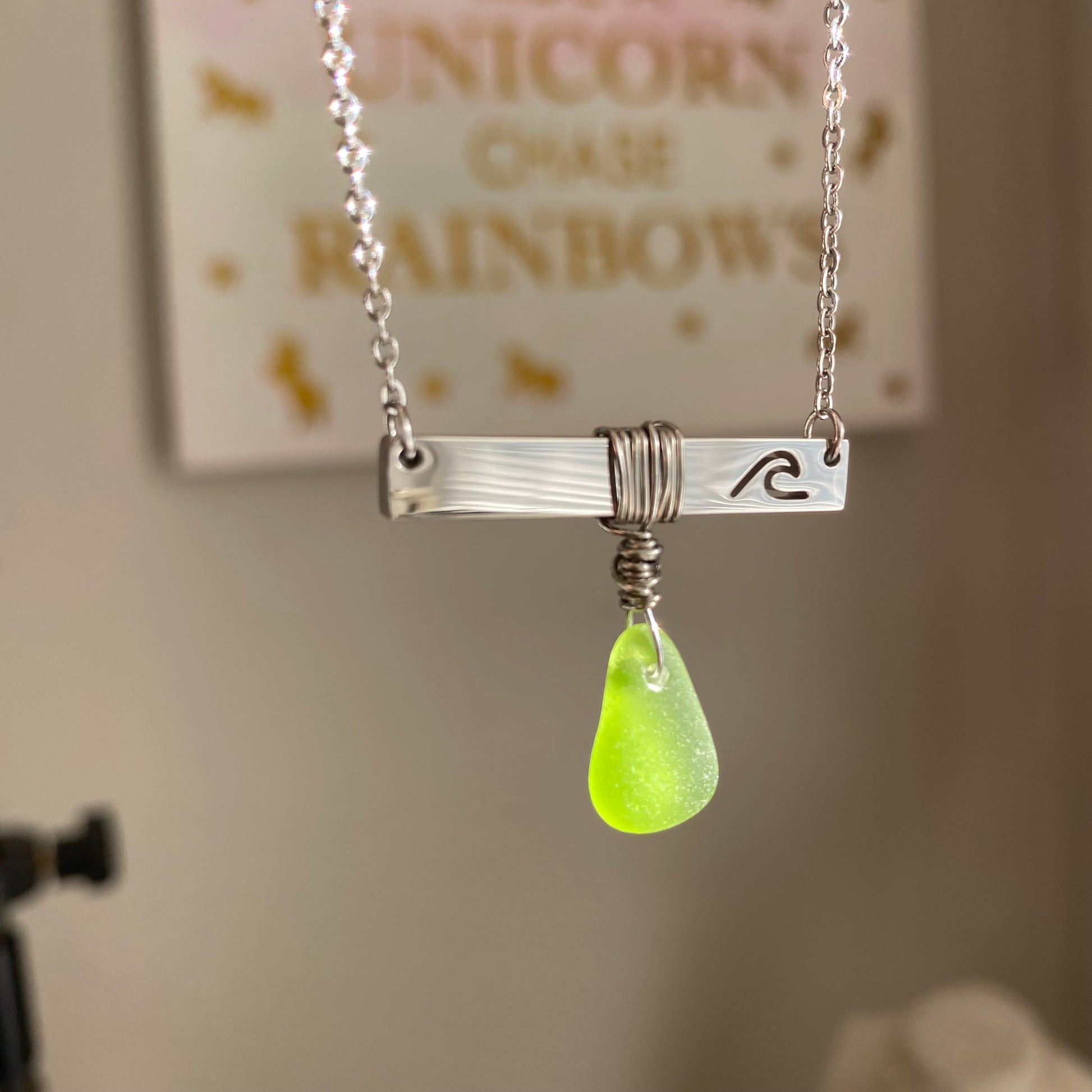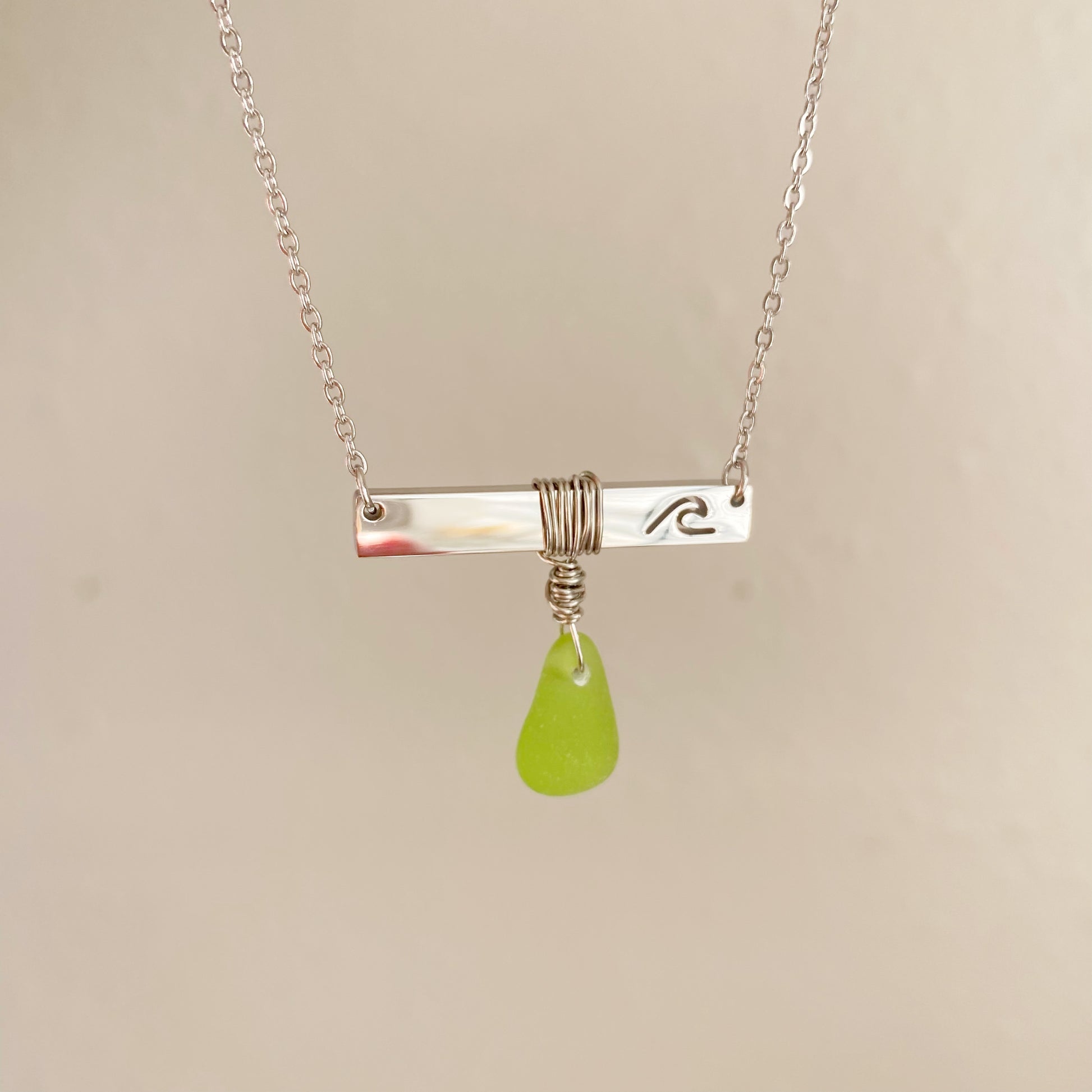 Silver Wave Bar Necklace with Lime Green Sea Glass