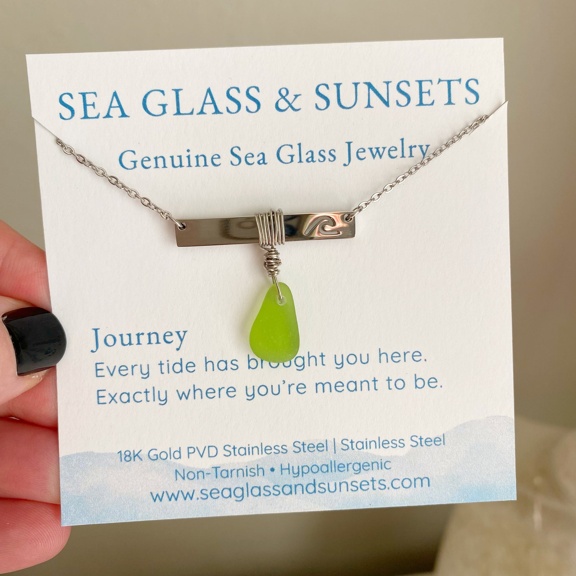 This vibrant lime green sea glass was once part of a bottle meant for everyday use, later shaped and softened by the sea into something rare, joyful, and full of life. Paired with a silver wave bar, it becomes a reminder to stay open to change, movement, and the unexpected beauty found along the way.