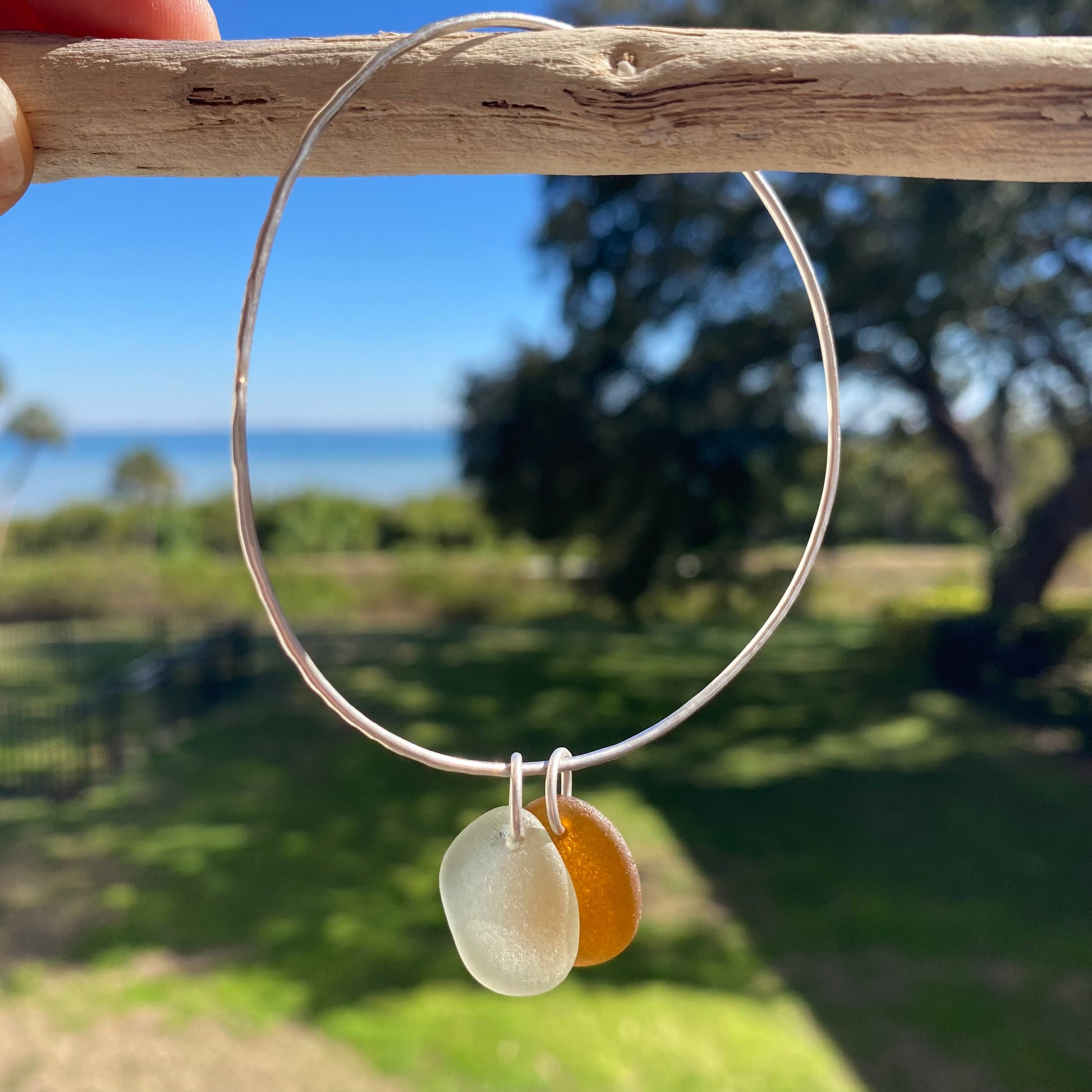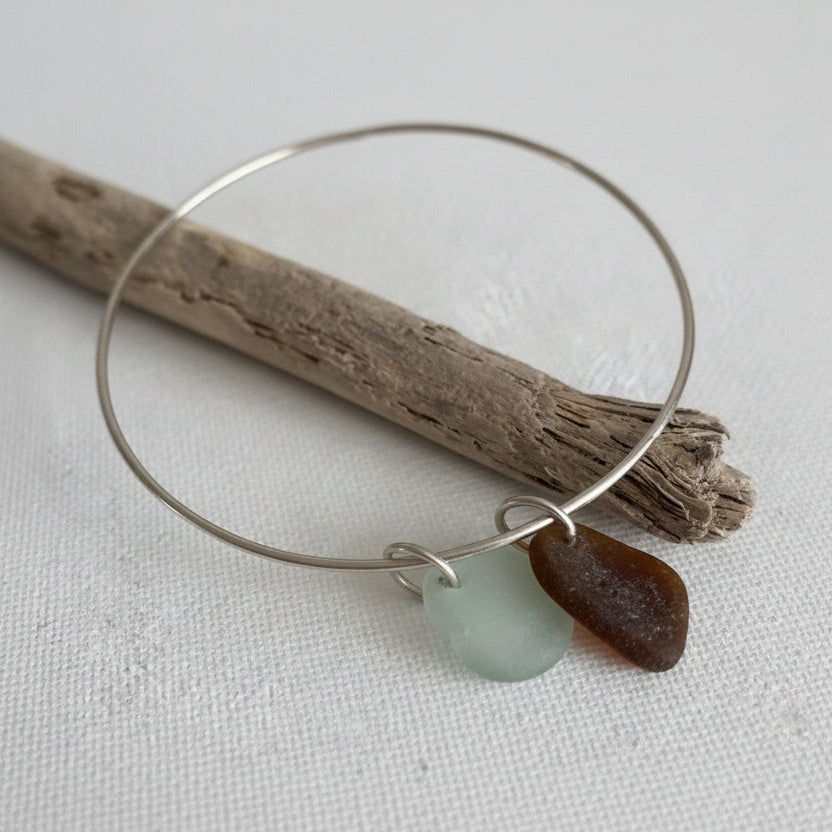 Sterling Silver Sea Glass Bangle Bracelet – Brown & Sea Foam